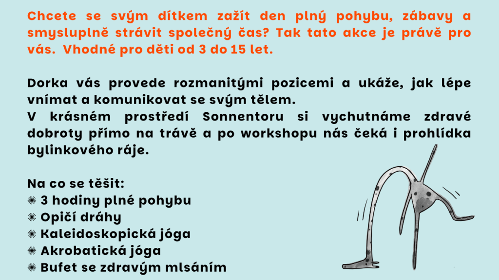 Ahoj, jmenuji se Dorka a jsem pohybová lektorka. Propojuji pohyb, zdravý životní styl a kreativitu. Kromě lekcí yogy a akrobacie nabízím také masáže, workshopy a víkendové pobyty zaměřené na pohyb a relaxaci. Objevte, co vás baví, rozvíjí a dodává energii. Připojte se k cestě za zdravím a harmonií.